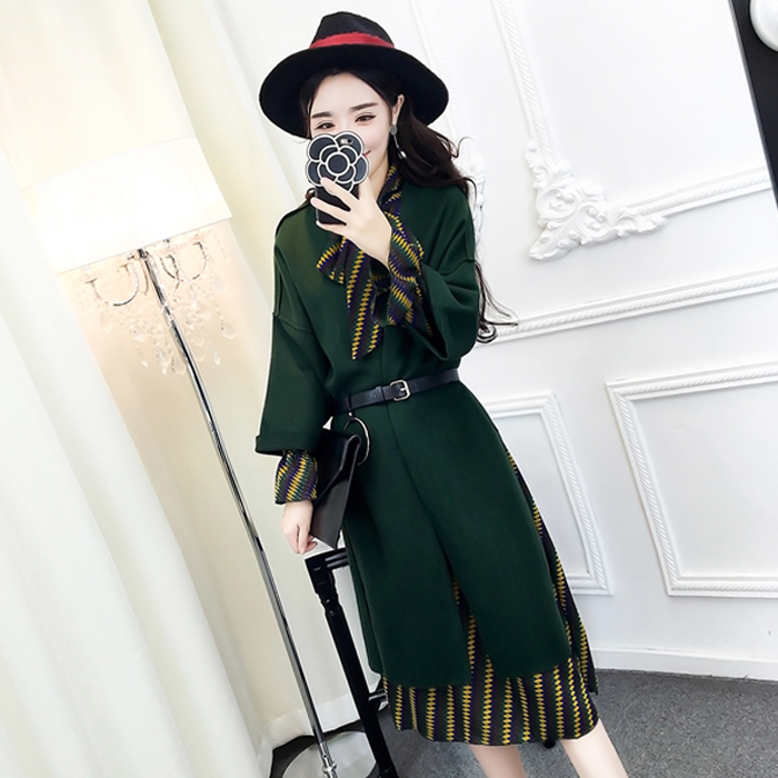 / 秋裝新款套裝韓版時尚條紋雪紡連衣裙+中長款毛呢外套女裝兩件套